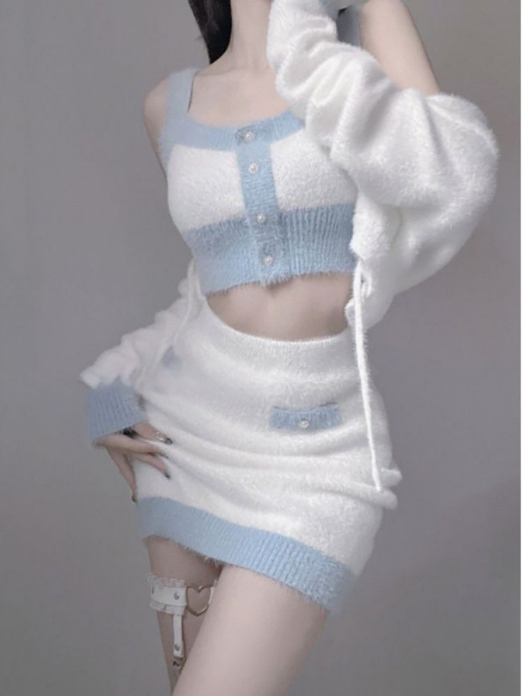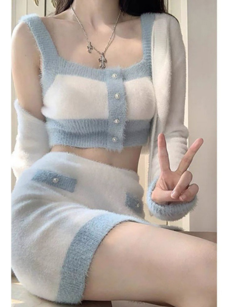 Make a statement with the autumn and winter's new knitted three-piece set, showcasing irresistible charm. From the elegant and sexy pure knit vest dress to the alluring yet sweet and spicy knit hip-hugging skirt, these pieces exude sophistication and allure. Square neckline, cardigan style, pullover closure, patchwork design detail, slim fit silhouette, regular thickness, long sleeves, regular sleeve style.