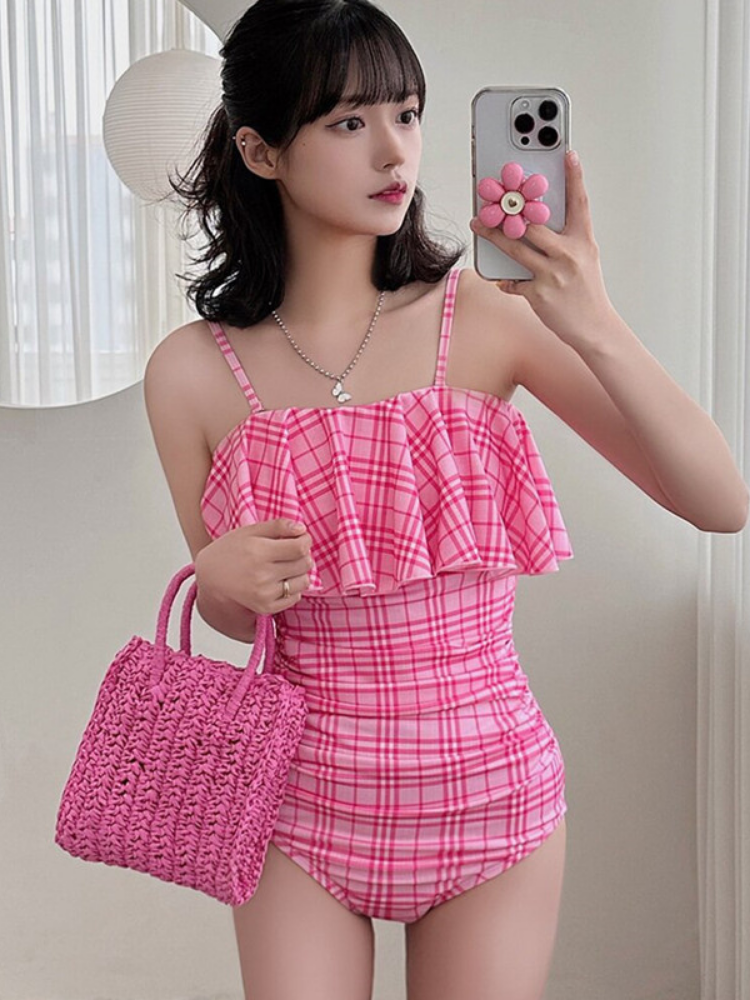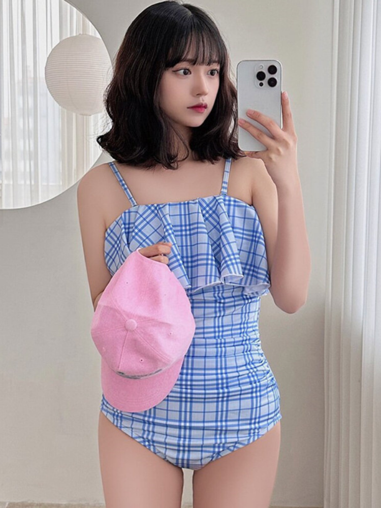 The Korean conservative thermal spring one-piece swimsuit features a grid pattern design that is both sexy and conservative, suitable for various occasions. Made of polyester fabric, it is comfortable and soft, with padded cups but no underwire, ensuring comfort and support.