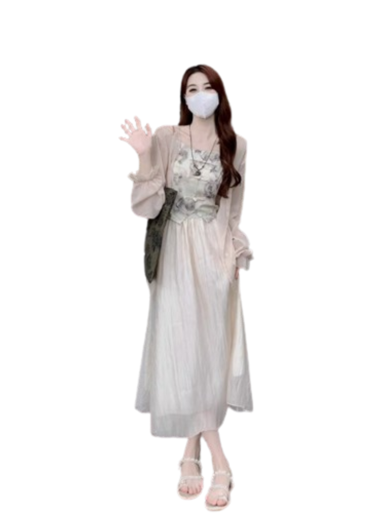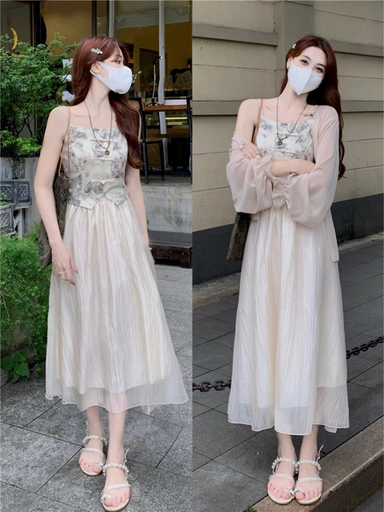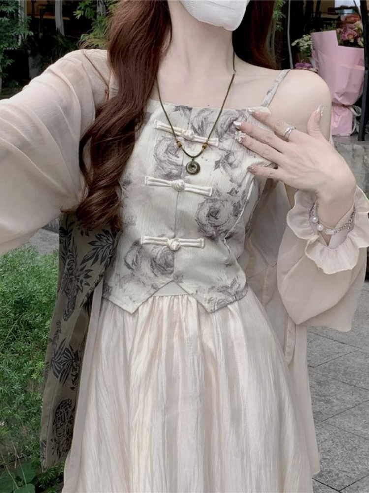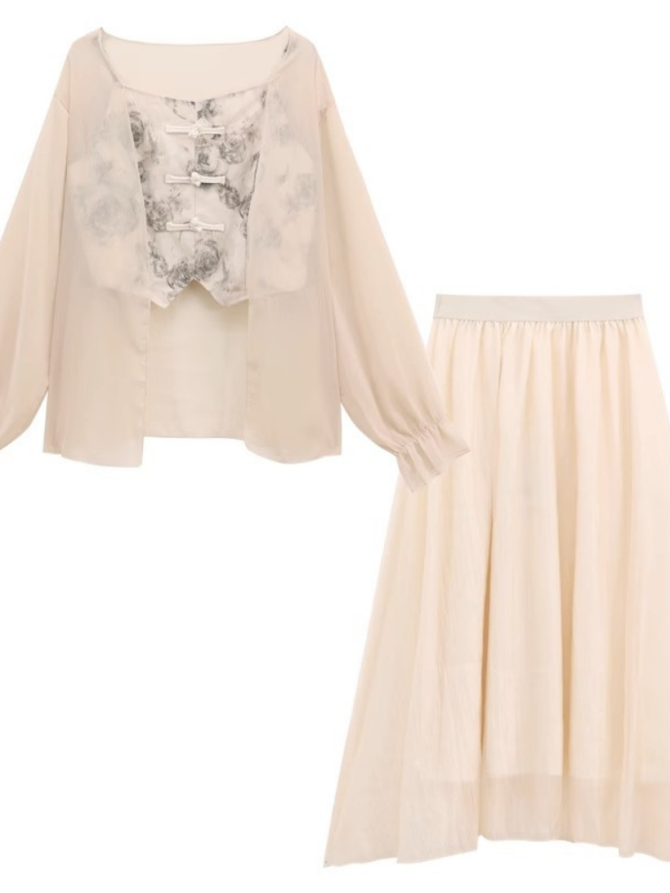 A fashionably versatile three-piece set that eliminates the hassle of figuring out how to match your outfit when going out. The camisole paired with a skirt is simple and clean, while the cardigan outer layer ensures you don't have to worry about sunburn even under the scorching sun. The camisole features button details and ink smudges, highlighting a Chinese style with a unique flair. The overall style is simple and elegant, making it a great choice for both daily wear and outings.