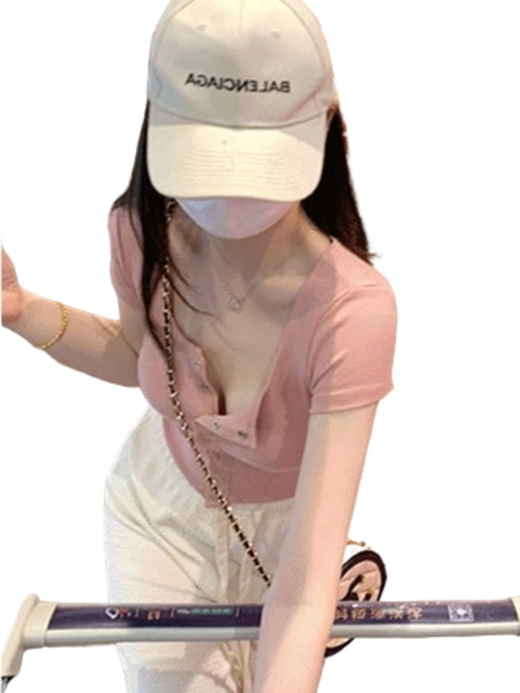 This versatile solid color T-shirt for commuting is paired with a large neckline design, perfectly showcasing graceful shoulder and neck lines and collarbones. Made of comfortable and breathable fabric, it won't feel stuffy. Additionally, the design features elastic double-row buttons, adding a touch of playfulness and vitality to the decoration. You can flaunt your style anytime, anywhere.