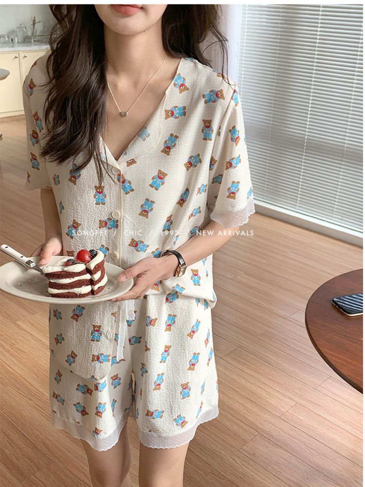 The summer breathable cute printed home outfit exudes a sense of fashionable leisure. Delicate bear prints add a cute touch to the overall look. The simple V-neck collar design showcases the elegance of women. Lace-trimmed cuffs emit an elegant charm, reflecting taste and delicacy. The lace waist rope sways gently, reminiscent of a summer breeze, bringing joy to the heart. The lace design at the cuffs is stylish and innovative. The soft and lightweight fabric ensures breathability and comfort, allowing you to fully enjoy the wearing experience.