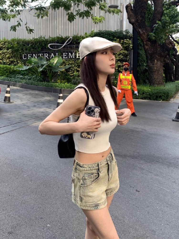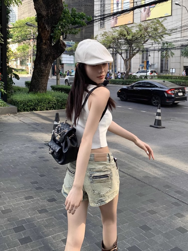 This denim shorts is made of denim fabric, featuring a basic style with a three-quarter length and high waist. It's adorned with distressed details, adding a trendy and dynamic vibe to the overall look. Additionally, the shorts are made of slightly stretchy fabric, ensuring comfortable and soft wearing experience, allowing you to effortlessly showcase your style and charm. It's highly versatile for both commuting and casual wear.